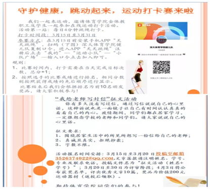 3月13日,国产视频 辅导员组织了全体留校学生在线观看了2022冬残奥会闭幕式。同学们在讨论区就精彩的比赛展开讨论,并分享了作为新时代大学生的心得体会。同学们积极发言,为中国体育的腾飞而激动,为祖国的强大而自豪!相信我们的祖国一定能带领我们战胜疫情。另外,国产视频 面向全院学生开展了“我给老师写封信”征文活动,以及云建身线上运动打卡活动,发布后获得了同学们的积极响应。