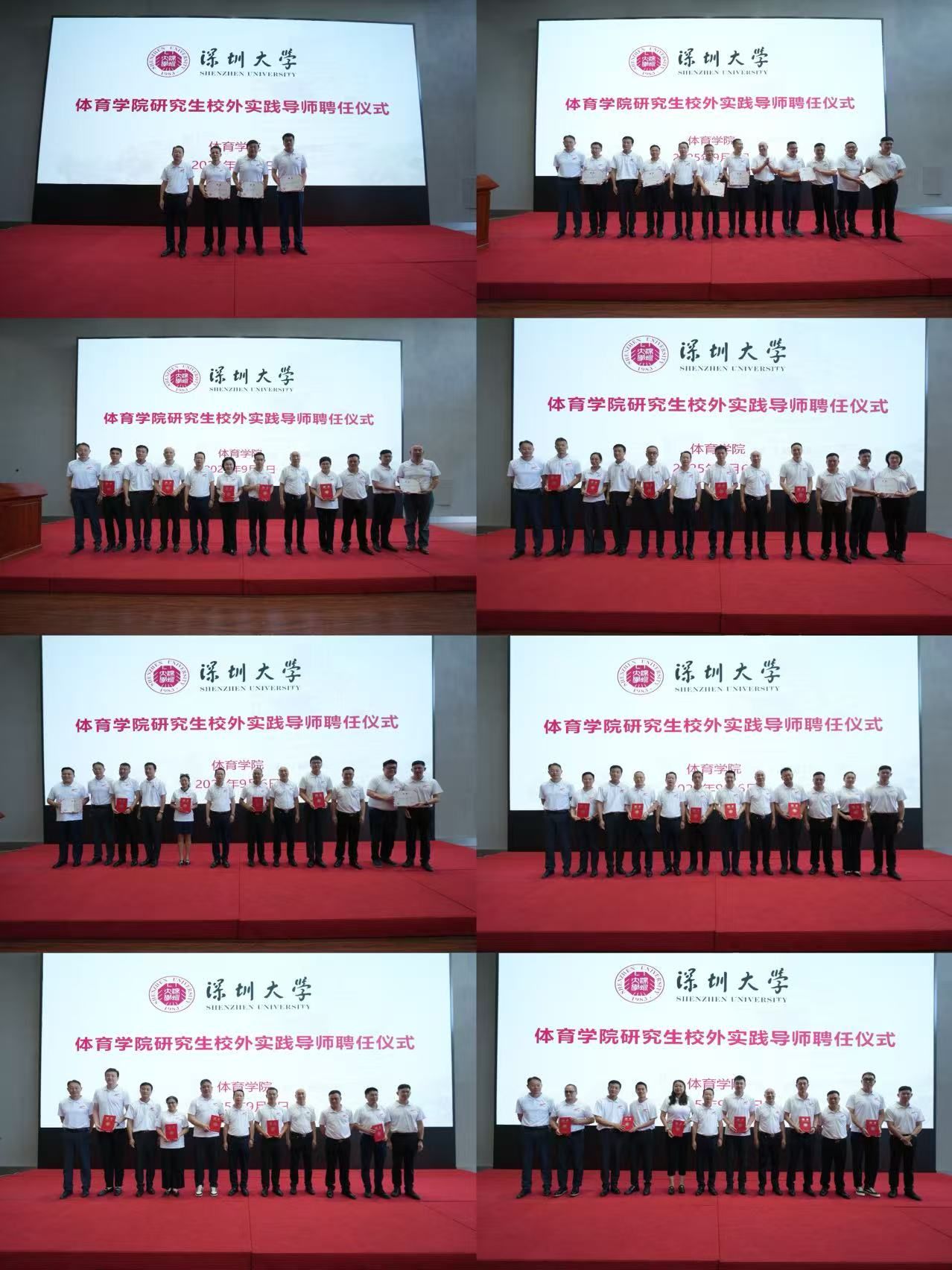 随后,学院领导班子为新聘校外实践导师颁发聘书并合影。中山市第一中学校长王长在作为新聘导师代表发言,表示将积极推动校内外导师协同合作,共同助力新时代体育研究生人才培养。