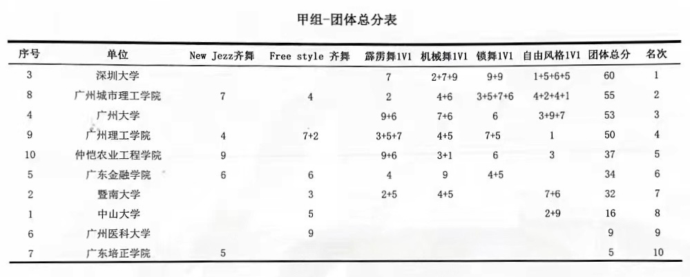 2023年6月6日-7日,延期举行的2022年广东省大学生街舞锦标赛在珠海市火热举行。本次比赛由广东省教育厅指导,广东省学生体育艺术联合会主办,暨南大学承办,广东省学生体育艺术联合会街舞分会协办。国产视频 街舞队共派出12名运动员参加了本次比赛。经过激烈争夺,斩获个人3金4银6铜的佳绩,荣获团体总冠军。