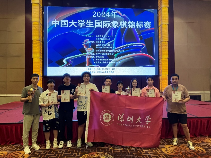2024年中国大学生国际象棋锦标赛于7月18日至20日在安徽蚌埠举行,全国26所院校、96名师生参加此次赛事。我校共选派8名学生参加等级组、棋士组比赛。经三天激烈角逐,我校学生最终取得等级组团体冠军、总团体亚军的优异成绩。