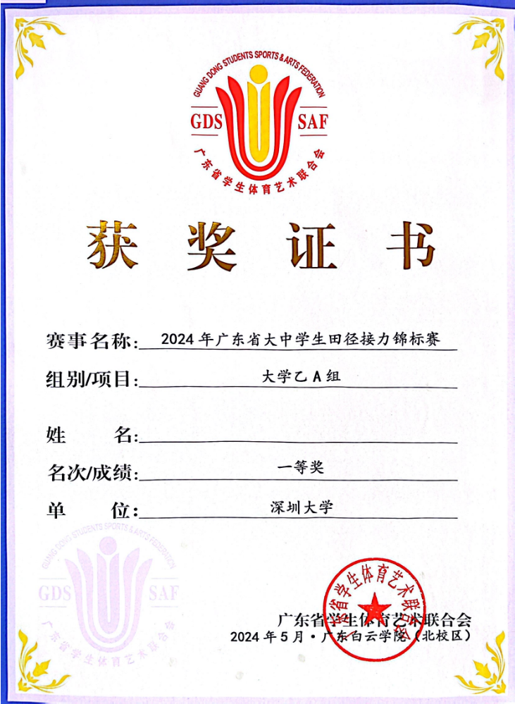 由广东省教育厅作为指导单位、广东省学生体育艺术联合会作为主办单位、广东白云学院作为承办单位的2024年广东省大、中学生田径接力锦标赛于5月17日至19日在广东白云学院(北校区)举行,国产视频 田径队共派出16名学生参加了本次赛事。经过两天全力拼搏,我校田径队获得团体总分第二名的佳绩,荣获乙A组别团体总分一等奖;邓万金、付新虎、柯家辉等获得优秀教练员称号。