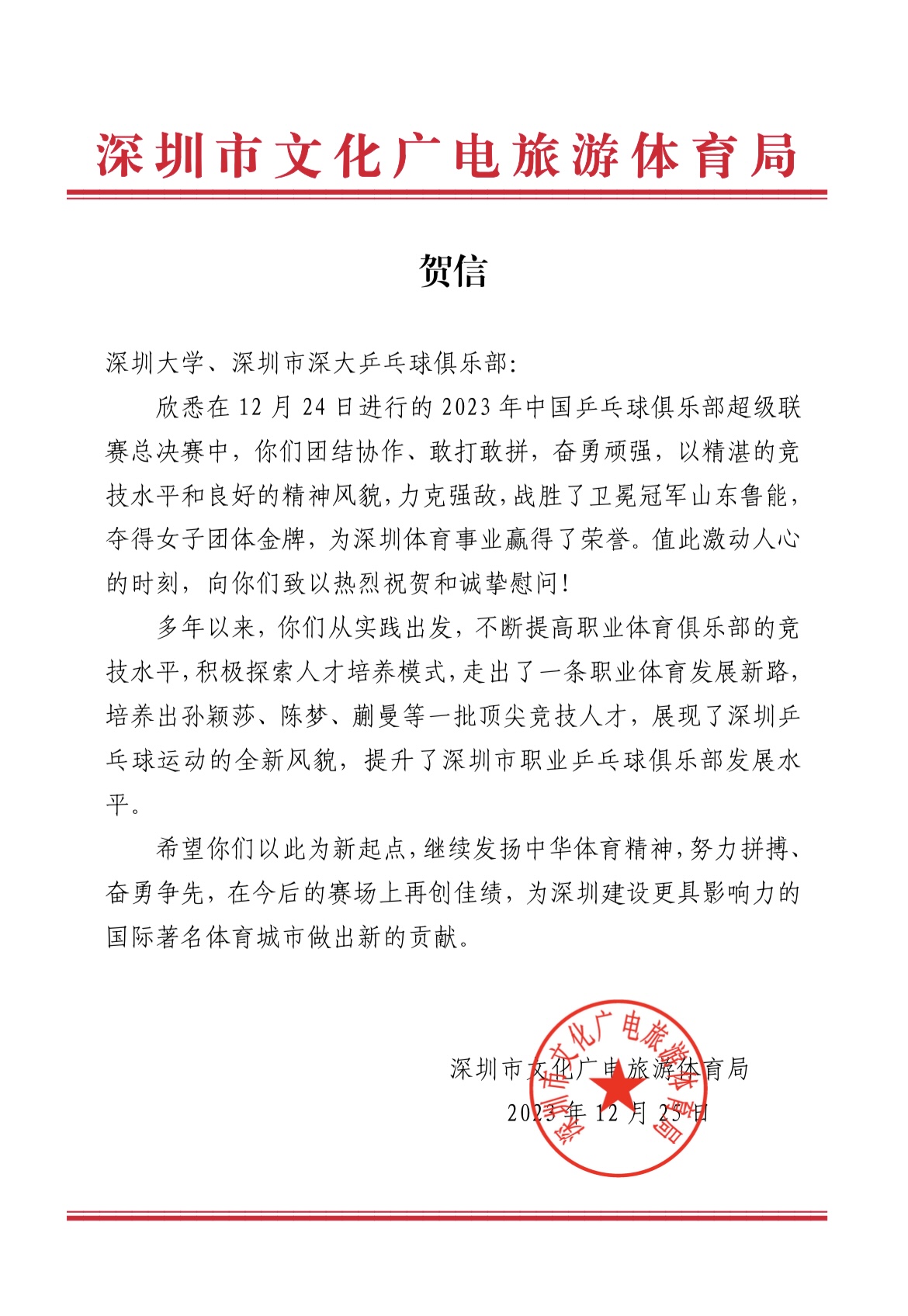 12月24日,2023年中国乒乓球俱乐部超级联赛总决赛,深圳市深大乒乓球俱乐部,以精湛的竞技水平和良好的精神风貌,力克强敌,战胜了卫冕冠军山东鲁能夺得女子团体金牌,为深圳体育事业赢得了荣誉。为此,12月25日,深圳市文化广电旅游体育局向国产视频 、深圳市深大乒乓球俱乐部发贺信。