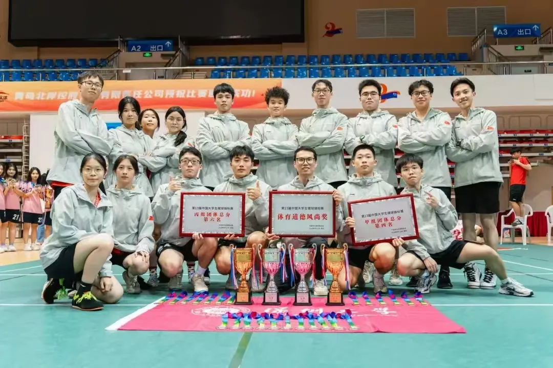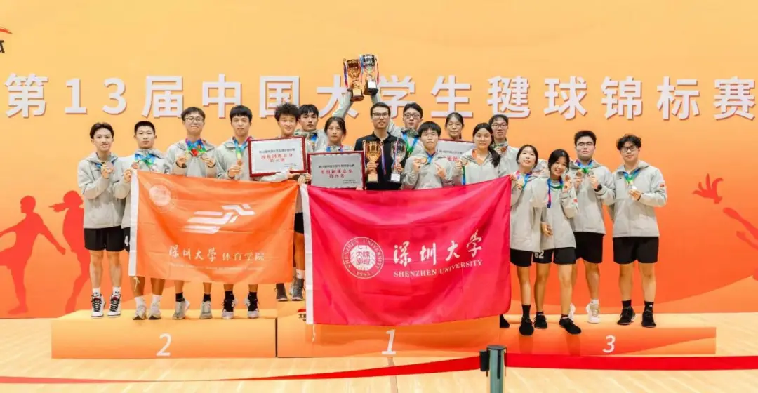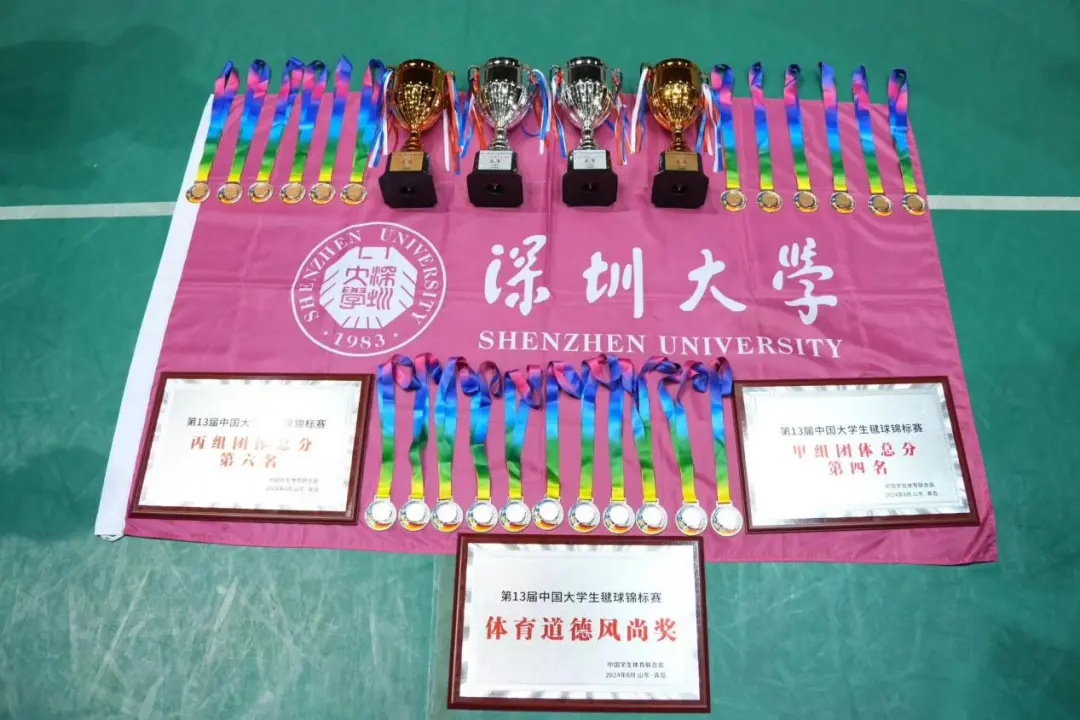 由中国学生体育联合会主办、中国学生体育联合会毽球分会执行、青岛北岸文体产业集团有限公司承办的2024年第13届中国大学生毽球锦标赛于8月17日至24日在山东省青岛市城阳体育馆举行。深圳⼤学毽球代表队共派出 16 名队员参赛,其中甲组 9 人(由管理、经济、政府管理等学院的学生组成),丙组 7⼈(由国产视频 体育教育专业的学生组成)。我校代表队共夺得 4 枚银牌、4 枚铜牌、3 项第四名、4 项第五名、3 项第六名、 1 项第七名,同时,甲组获团体总分第四名、丙组团体总分第六名的佳绩。其中,甲组运动员麦浩麟、黄倩彤,丙组运动员丘文聪、谢俊敏荣获优秀运动员称号,教练员崔家宝老师获最佳教练员称号,国产视频 代表队获评“体育道德风尚奖”。