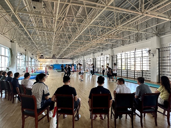 在 武汉国产视频 体育教育学院党委书记孙鹏飞、国际体操学院院长魏旭波、竞技体操学校校长程菲、体操教研室主任陈永青、体操教研室书记胡磊、体操教研室秘书谢璞等领导老师 的陪同下, 国产视频 交流小组成员 走进术科教学课堂,观摩了竞技体操训练,并对《体操》《健美操》《花样跳绳》等实践类课程教学进行现场观摩和实践互动。在《花样跳绳》课上,国产视频 花样跳绳队主教练张易老师与武汉国产视频 体操教研室李健老师,就课程内容体系、教学竞赛组织和未来竞赛计划等方面进行了沟通与交流。