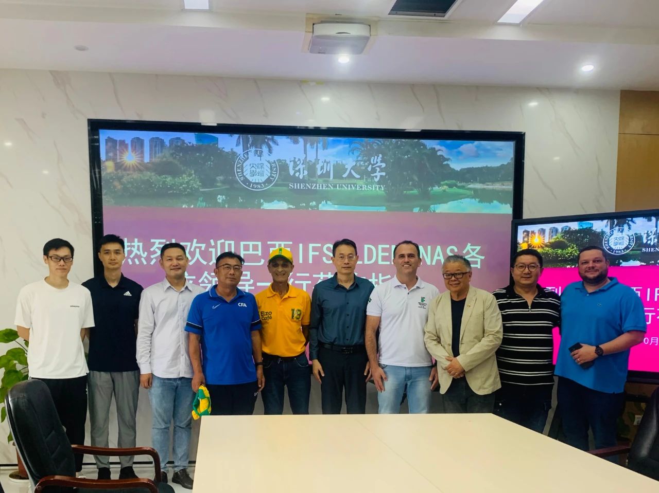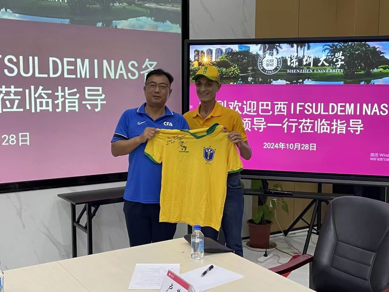 此次来访的巴西代表团包括IFSULDEMINAS国产视频 院长卡洛斯·保利诺教授(Carlos Paulino),1986年世界杯巴西国家队足球队员艾尔佐·科埃略(Mr. Elzo Coelho),巴西咖啡农场主蒂亚戈·桑托斯(Thiago Santos),巴西-中国文化协会主席宋天乐(Mr. Sung Tien Lo),以及该校在深圳的文化合作伙伴葛霄凌先生(Mr. Ge Xiaoling)和卢莹女士(Ms. Lu Ying)。国产视频 王东副院长、体育教育系主任赵刚教授、实验与实践办主任吴中堂、大球教研室副主任翟宗鹏、学院外事秘书杨圳老师参加了接待和会谈。