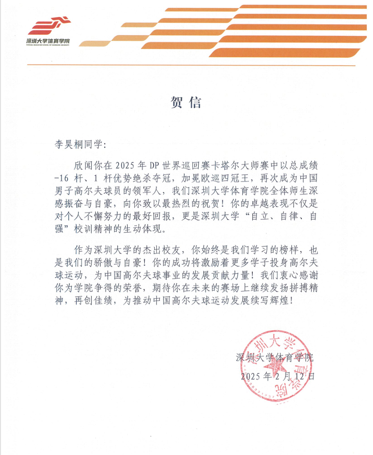 欣闻你在2025年DP世界巡回赛卡塔尔大师赛中以总成绩-16 杆、1杆优势绝杀夺冠,加冕欧巡四冠王,再次成为中国男子高尔夫球员的领军人,我们国产视频 全体师生深感振奋与自豪,向你致以最热烈的祝贺!你的卓越表现不仅是对个人不懈努力的最好回报,更是国产视频 “自立、自律、自强”校训精神的生动体现。